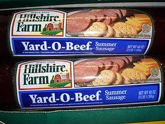 When I was in the 6th or 7th grade I remember going to Jackson, MS, the state capitol, with my church youth group. At the time, Jackson "The Bold New City", was the only city in the whole state with a MALL and this mall had a glass elevator...ooooohhhh... AND a Hickory Farms store....aaaaahhhhhh.....and THIS was my primary reason for going to church on a regular basis. Not fellowship with teenaged, like-minded Christians, sorry mom and dad (and Jesus), but for the chance to endure a 4 hour van or bus ride a couple of times a year to go to the MALL, more specifically to go to a store in the mall that was known for its sausage...(please note I KNOW this image is of Hillshire Farms summer sausage but come on-it's a yard-o-beef regardless!)