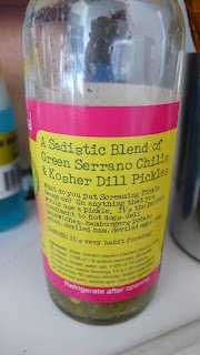 " A sadistic blend" is RIGHT. The strong pickle flavor is what you notice first but the serrano chili heat sneaks up on you, especially when you've dumped half a bottle on your lunch. I don't know what you're really supposed to eat it on, but for me, the answer is EVERYTHING. If I had enough I'd give bottles out to Trick or Treat-ers, but I don't, so stay away kids.