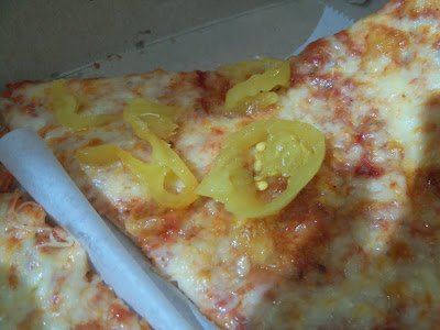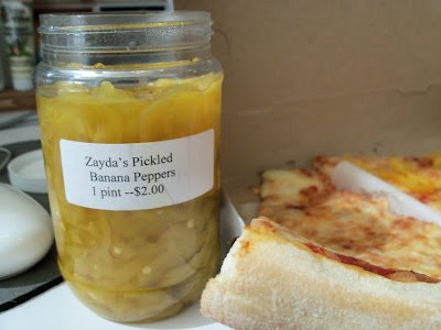 Earlier Kevin had already brought me more products from Zayda's Pickles, this time Pickled Banana Pepper Rings but because I work so hard, I'd totally forgotten they were stashed in the fridge and then I got a migraine and forgot who Kevin Finklea even was, until he walked in the gallery one more time. This time he brought me 2 slices of pizza because I was floating on air from all the Excedrine Migraine pills I'd eaten over the past 2 days, and without a doubt saved my life that day.