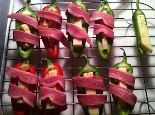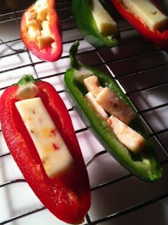 I had a few cubes of salsa jack cheese from Whole Foods and a few wrapped pepper jack string cheese things (?) so I washed, split and seeded my peppers and stuffed them with cheese. Next I took a few slices of bacon (I only had turkey bacon) and split each right down the middle into 2 thinner slices and wrapped them around my stuffed peppers.