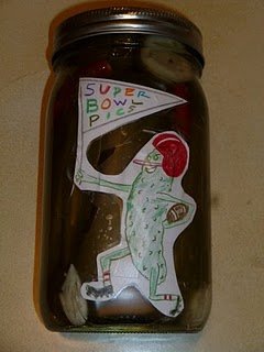 They arrived at my door the night before the Super Bowl with their very own label drawn and attached to the jar and the next night they assumed their place on the mighty party table amongst the cheeses and cheese filled things.